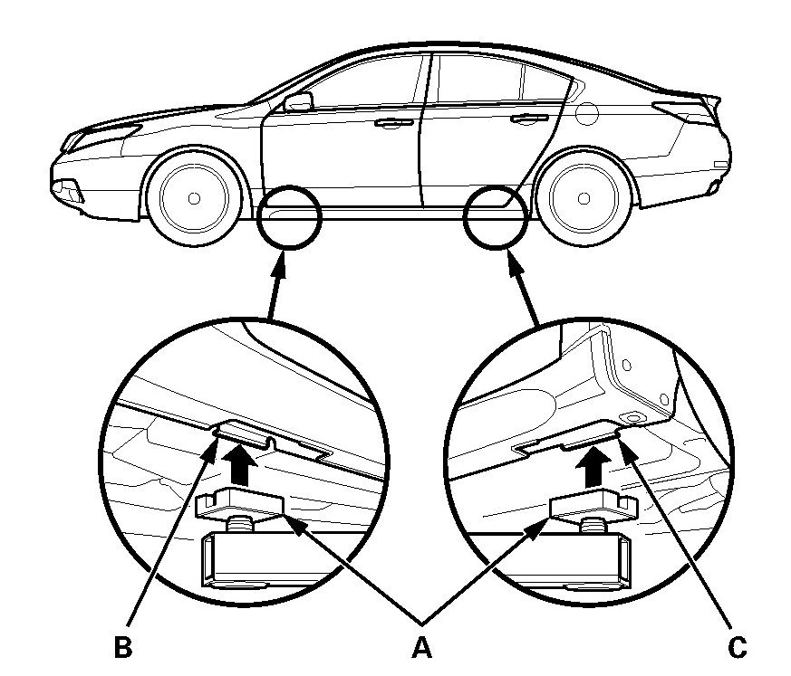 1. Position the lift pads (A) under the vehicle's front support points (B) and rear support points (C).