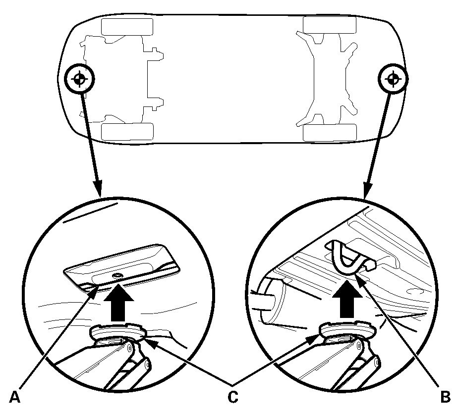 3. Position the floor jack under the front jacking bracket (A) or the rear jacking bracket (B). Center the jacking bracket on the jack lift platform (C), and jack up the vehicle high enough to fit the safety stands under it.