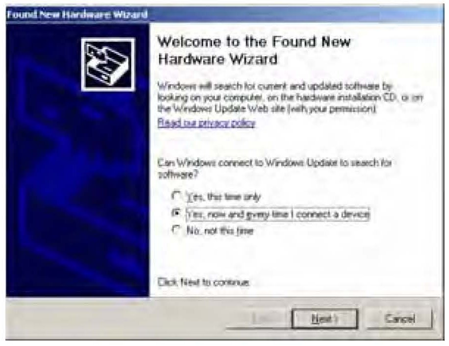 3. The Found New Hardware Wizard may appear. If it does, select Yes, now and every time I connect a device, then select Next.