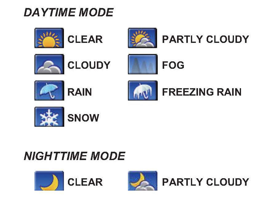 XM Radio now offers XM weather and radar that shows current local weather as weather icons on the map screen. These are different from weather related traffic incident icons. The weather icons are: