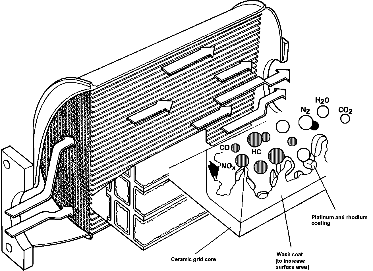 The three way catalytic converter simultaneously removes up to 90% of all three major pollutants, (HC, CO, and oxides of nitrogen). A complete catalytic reaction is dependent on the fuel mixture staying within a very narrow range (+/- 1% of 14.7:1) which can only be achieved with a properly functioning oxygen sensor system. The catalytic converter consists of a metal housing, a ceramic grid substrate, and the catalytic coating of platinum and rhodium. The active metal content is about 2 grams of platinum/rhodium.