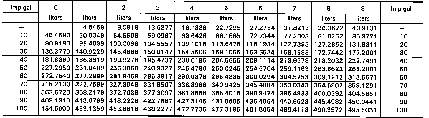 Fig. 10 Conversion Table, Imperial Gallons To Liters: