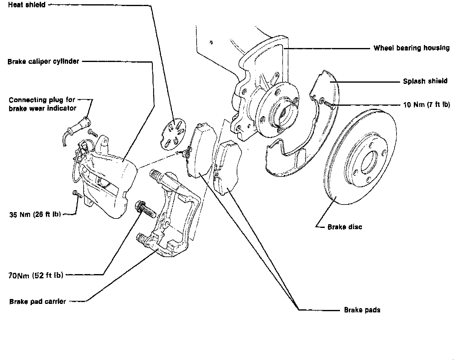 10. Upon reassembly after heat protection plate replacement, depress brake pedal firmly several times while vehicle is stationary to permit piston and brake pads to adjust to disc.