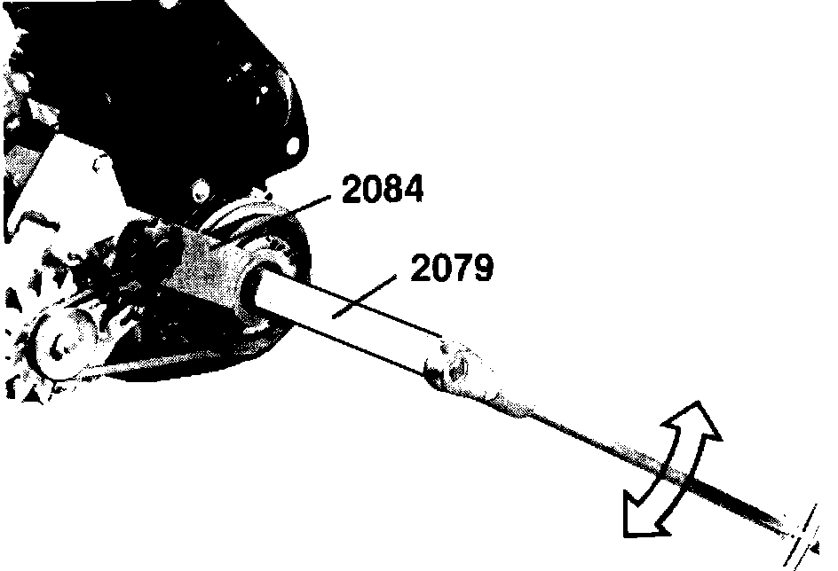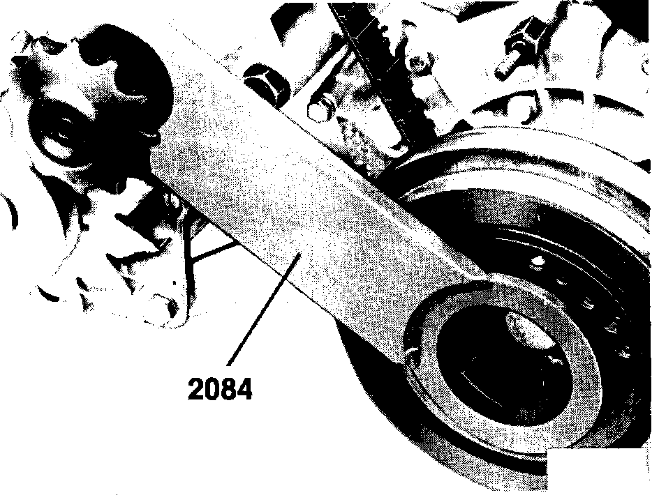 6. To loosen the front crankshaft damper bolt, use Volkswagen tool No. 2084 (or equivalent) to hold the crankshaft in position and Volkswagen extention tool No. 2079 (or equivalent) with a suitable ratchet, to break the bolt loose. DO NOT REMOVE the bolt at this time.