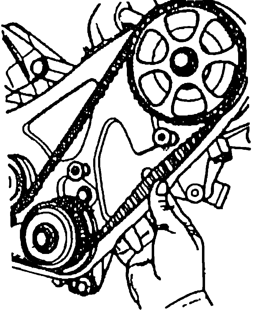 19. The timing belt is properly tensioned when it can be twisted 90 degrees at the midway point between the camshaft and water pump sprockets. Grasp the belt as shown, when checking the tension.