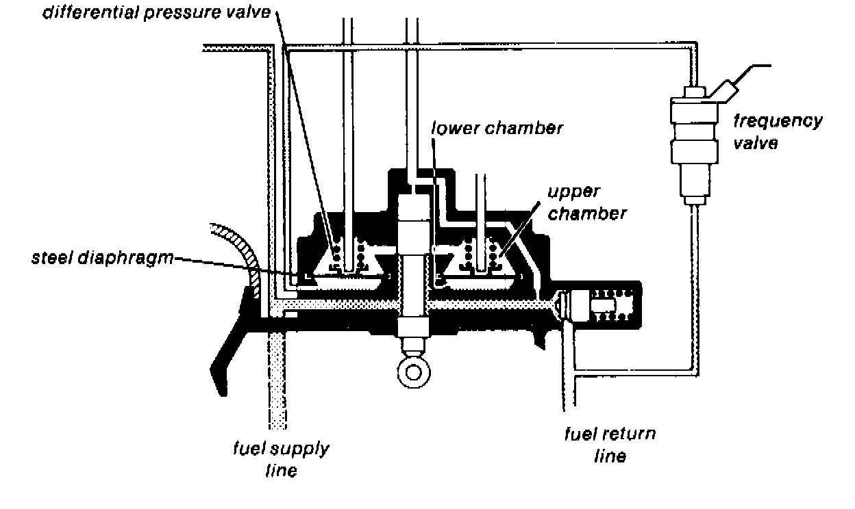The frequency valve resembles an electronic fuel injector which has been modified to accept the different fuel lines. The valve is connected between the lower chambers of the fuel distributor and the fuel return line.