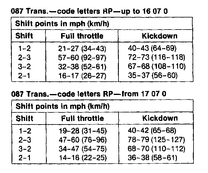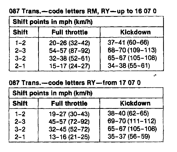 A/T Type 087 Shift Points, (Full Throttle / Kickdown):