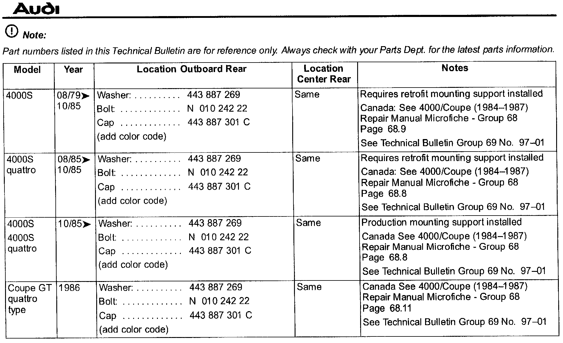 ^ Can be retrofitted beginning m.y. 1999 except, A8L (long wheel base) and TT (see table)