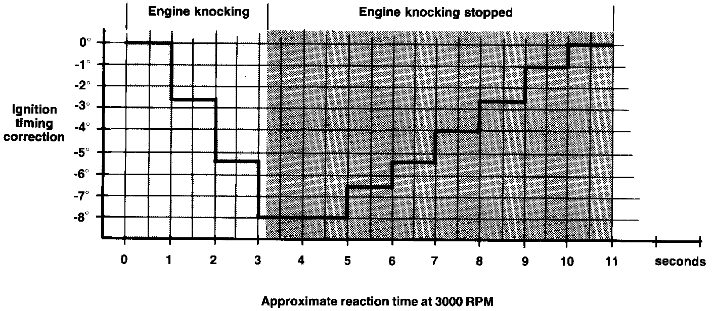 If a cylinder develops ignition knock (detonation), the control unit will "hear" this through the knock sensor. The engine control unit will then retard the ignition timing by one step of 2.6°. The engine control unit will then check to see if knocking has stopped. If knocking continues, the timing can be retarded two additional steps of 2.6° each for a total of 7.8°.
