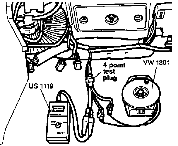 - Connect VW 1301 to terminals S and A on 4 point test plug (wires are blue and blue/white).