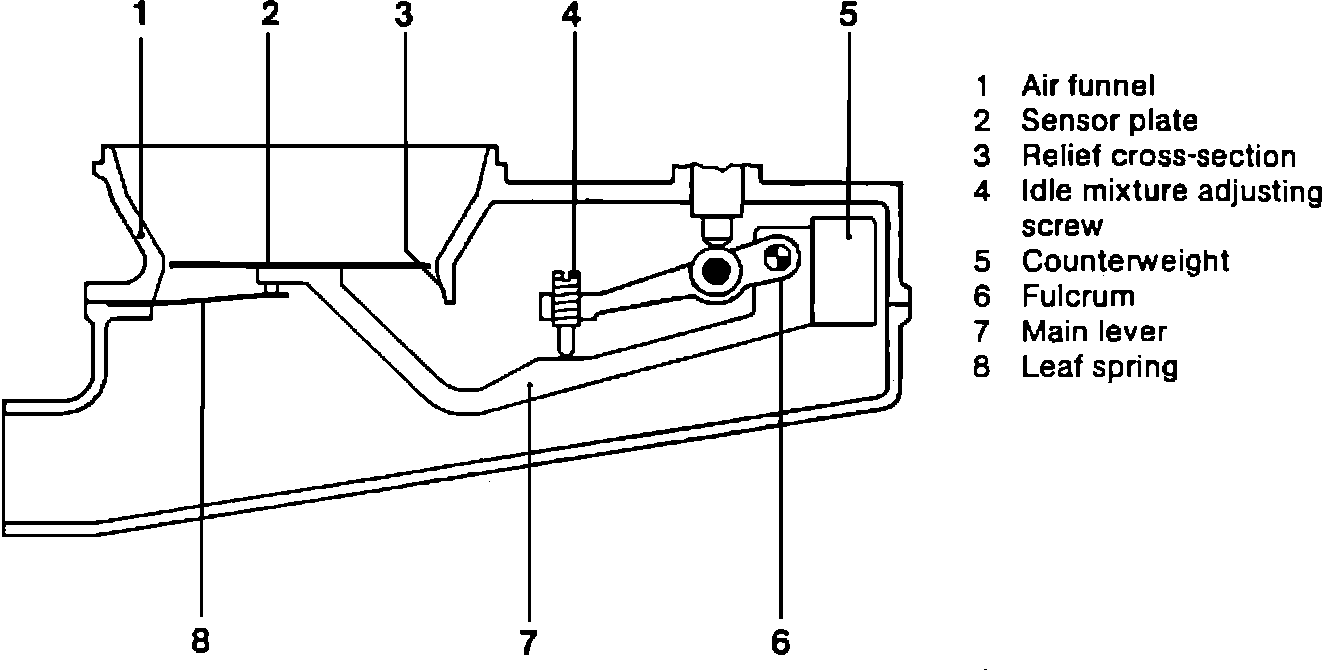 The air flow sensor is mounted in the intake air stream between the air cleaner and throttle body. The unit consists of an air flow sensor flap and venturi funnel. The air flow sensor plate is mechanically connected to the control plunger, causing the plunger to rise and fall in direct relation to the amount of air entering the engine. Air/fuel mixtures are also tailored to engine operating conditions by the venturi shape of the cone in which the air flow sensor plate operates. At idle, when air flow volume is relatively low, the cone shape increases pressure under the sensor plate, providing additional lift to enrich air/fuel mixtures. At part throttle the cone design causes the sensor plate to float lower than air flow through a straight sided cone would dictate, providing leaner mixtures for improved economy. During full throttle operation the venturi shape increases air velocity, providing additional lift to the sensor plate and richer air/fuel mixtures for maximum power output.