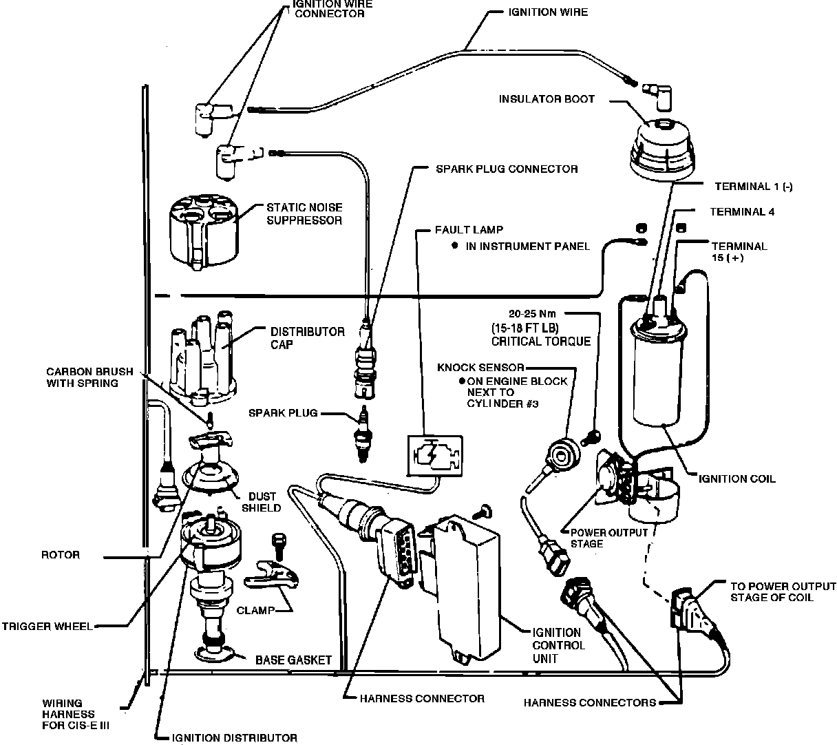 The CIS-E III engine control system is a mechanical, continuous injection system which is electronically controlled. The system is based on the Bosch KE-Jetronic fuel injection system. Two separate electronic control units (ECUs) are used. One controls the fuel delivery while the other controls the ignition system. The ECUs share information from various engine sensors and use this information, compared with information stored in their individual memories, to precisely control the fuel and ignition systems for lower exhaust emissions, better fuel economy and better engine performance, under all operating conditions.