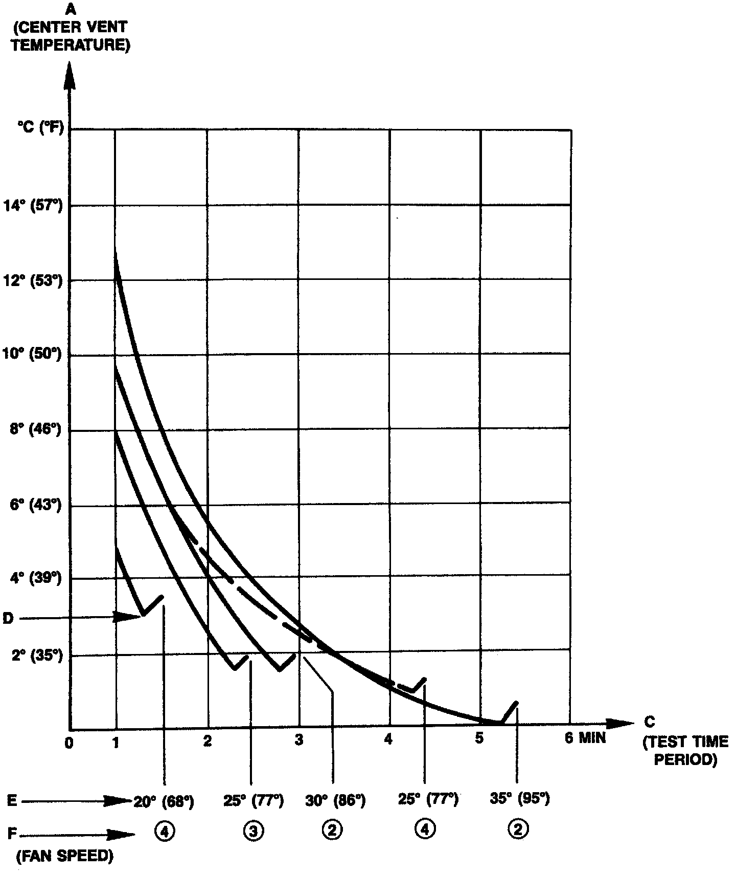 5. Read temperature from center when A/C compressor clutch disengages (D on graph)