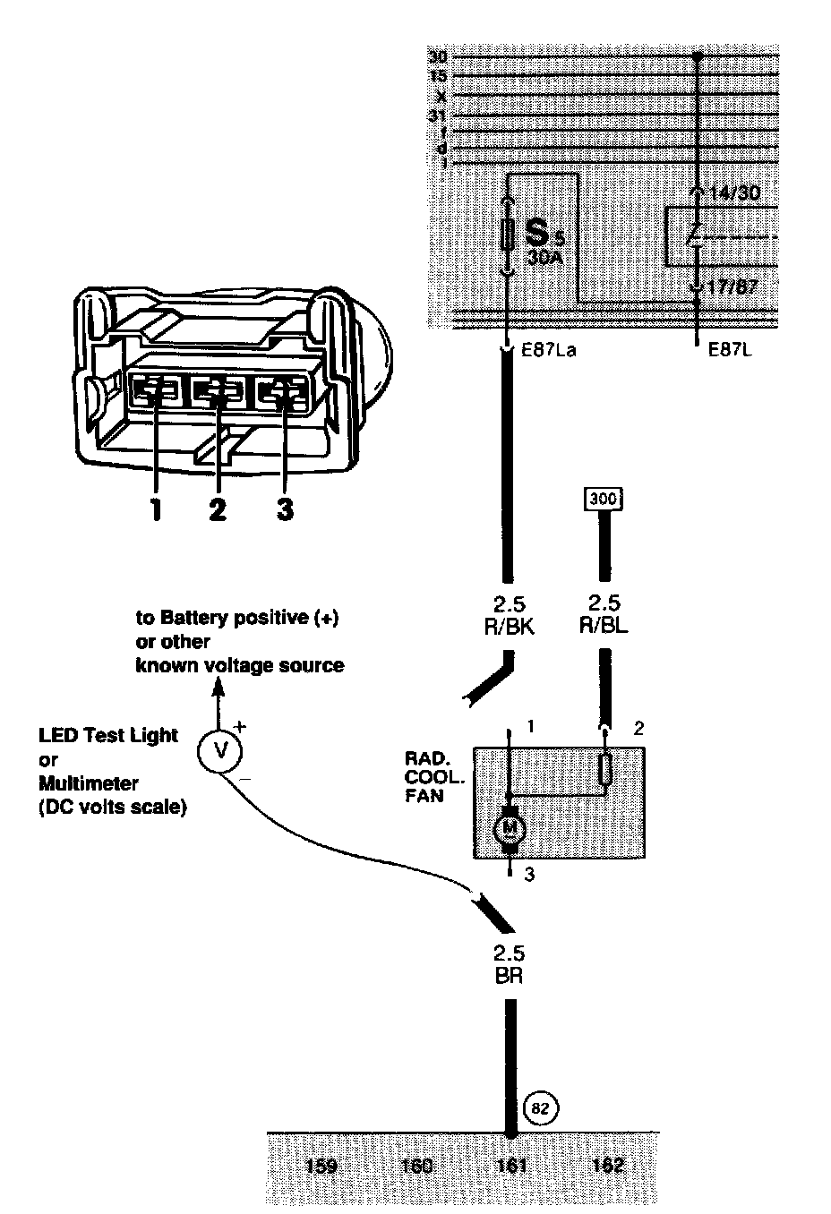 Voltage: If the test light or multimeter indicates voltage, then there is potential for current flow between the known voltage source and ground at the test point. The ground side of the circuit, between terminal 3 of the fan connector and battery negative (-), is OK.