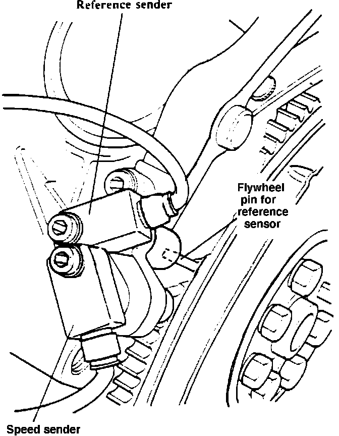 The engine speed sensor located on the rear of the engine block, is a magnetic induction type sensor.