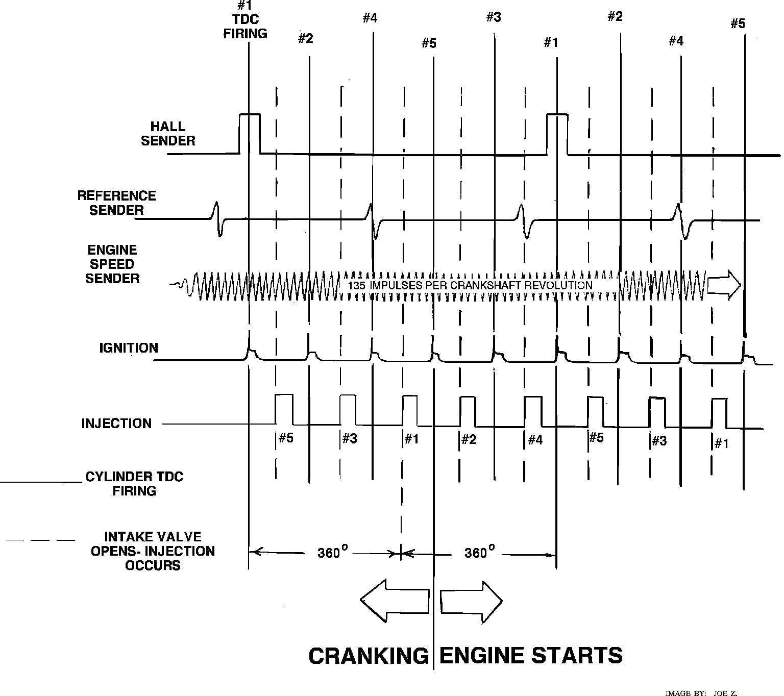 When the ignition is turned on, all the injectors receive power at one of their terminals through an array of series resistors (one for each injector). Each injector has its own ground circuit through the ECU. Each injector is energized individually when the ECU completes that circuit to ground. The ECU "knows" when to fire each injector by comparing the signals from the hall sensor and the crankshaft position sensor (reference sensor). When the hall sensor signal occurs at the same time as the reference sensor signal, cylinder #1 is at TDC of its power or firing stroke (reference point). The intake valve for cylinder #5 will open approximately 72~ of crankshaft rotation later. When the reference point is sensed, the ECU counts 27 impulses from the engine speed sensor and begins injection with cylinder #5. Once the reference point is established during cranking, and the #5 cylinder injector is fired, the ECU counts 54 flywheel teeth (144~ of crankshaft rotation) and then fires the next injector, and so on. Injectors are energized in the same order as the ignition firing order, so that injection for each cylinder occurs one crankshaft revolution after TDC of the power stroke for that cylinder, corresponding to the opening of the intake valve.