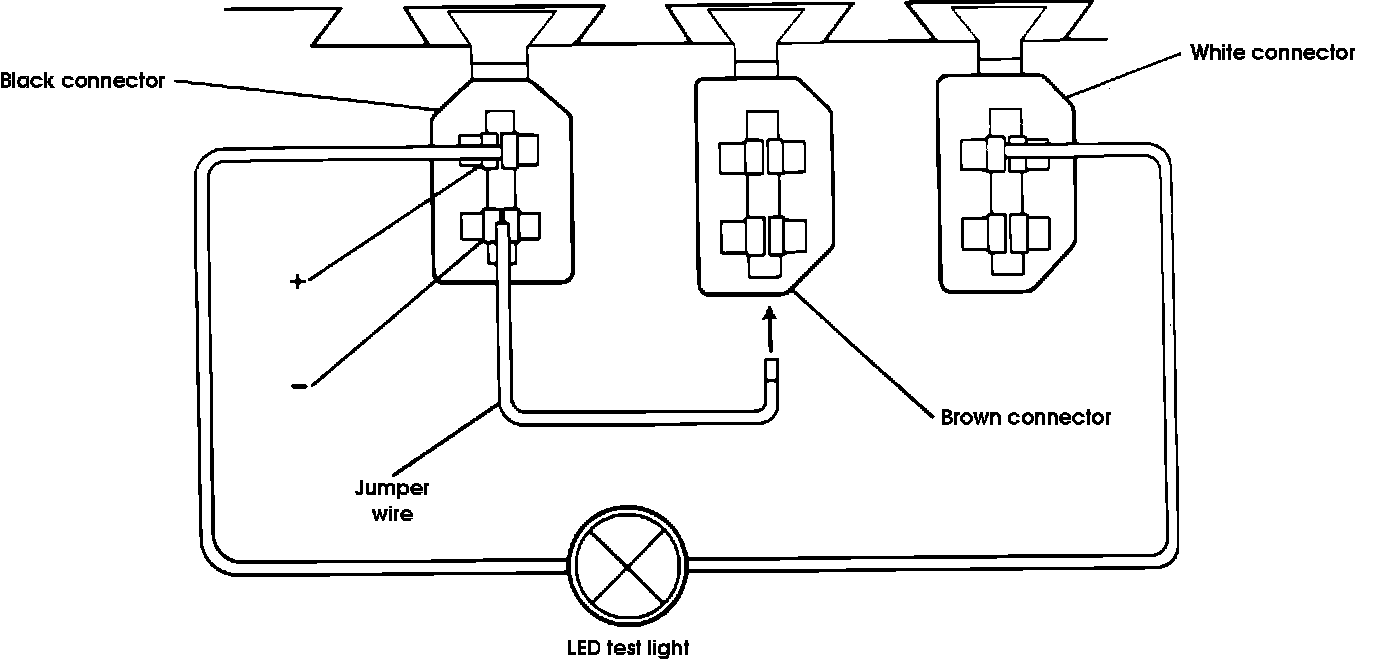 1. With ignition turned "off", connect LED test light and jumper wire to terminals of diagnostic connectors, as when performing fault memory display. Make sure jumper wire is connected to both connectors, and leave connected until after ignition is turned on.
