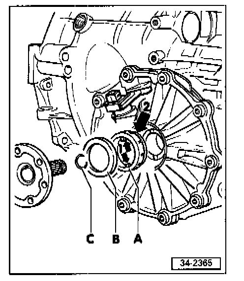 - Replace oil seal -B- and drive flange shaft circlip -C-.