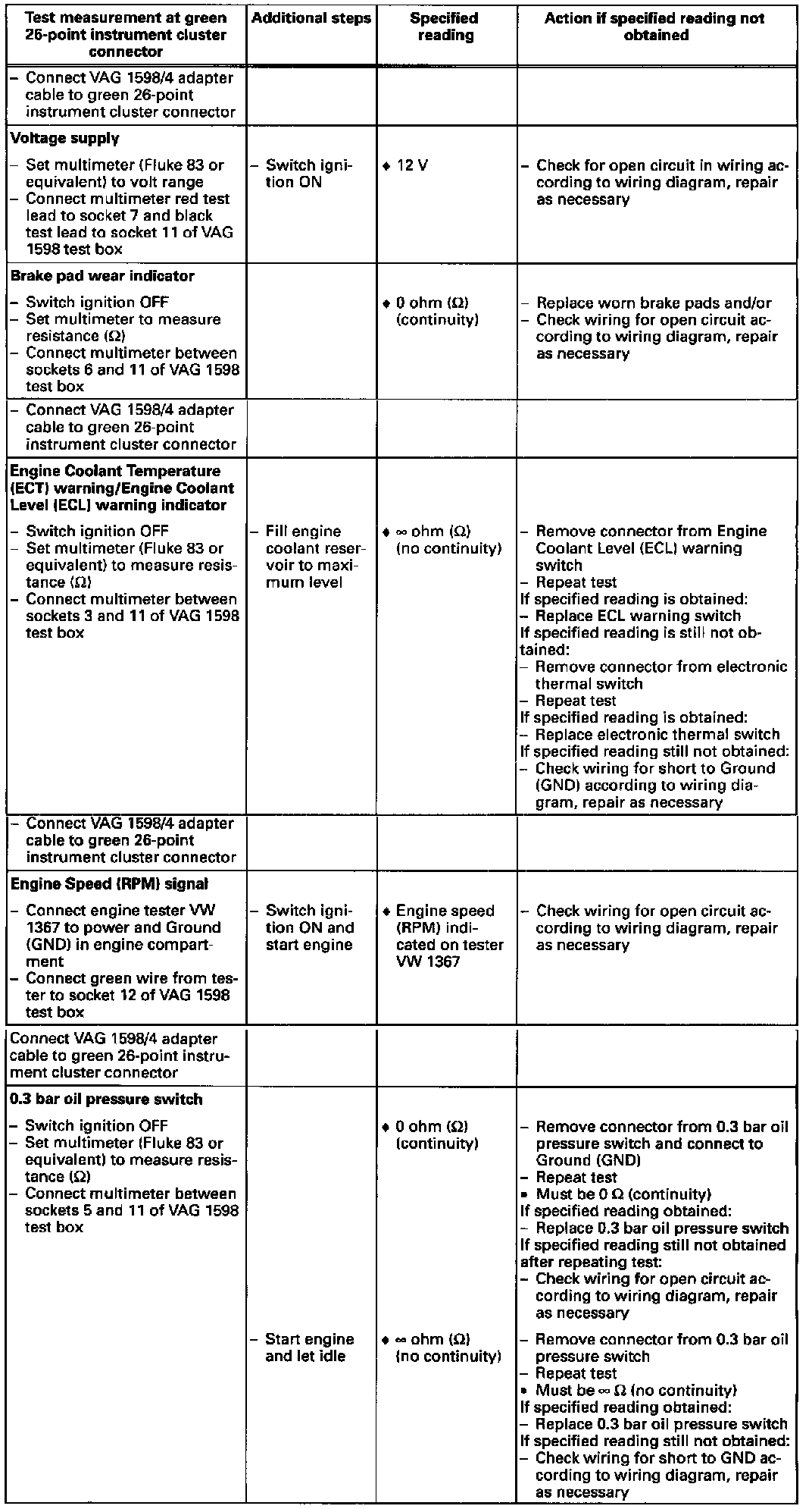 - Use digital multimeter (Fluke 83 or equivalent), connector test kit VW 1594, VAG 1598 test box, VAG 1598/4 adapter cable and VAG 1598/20 test adapter when performing electrical checks
