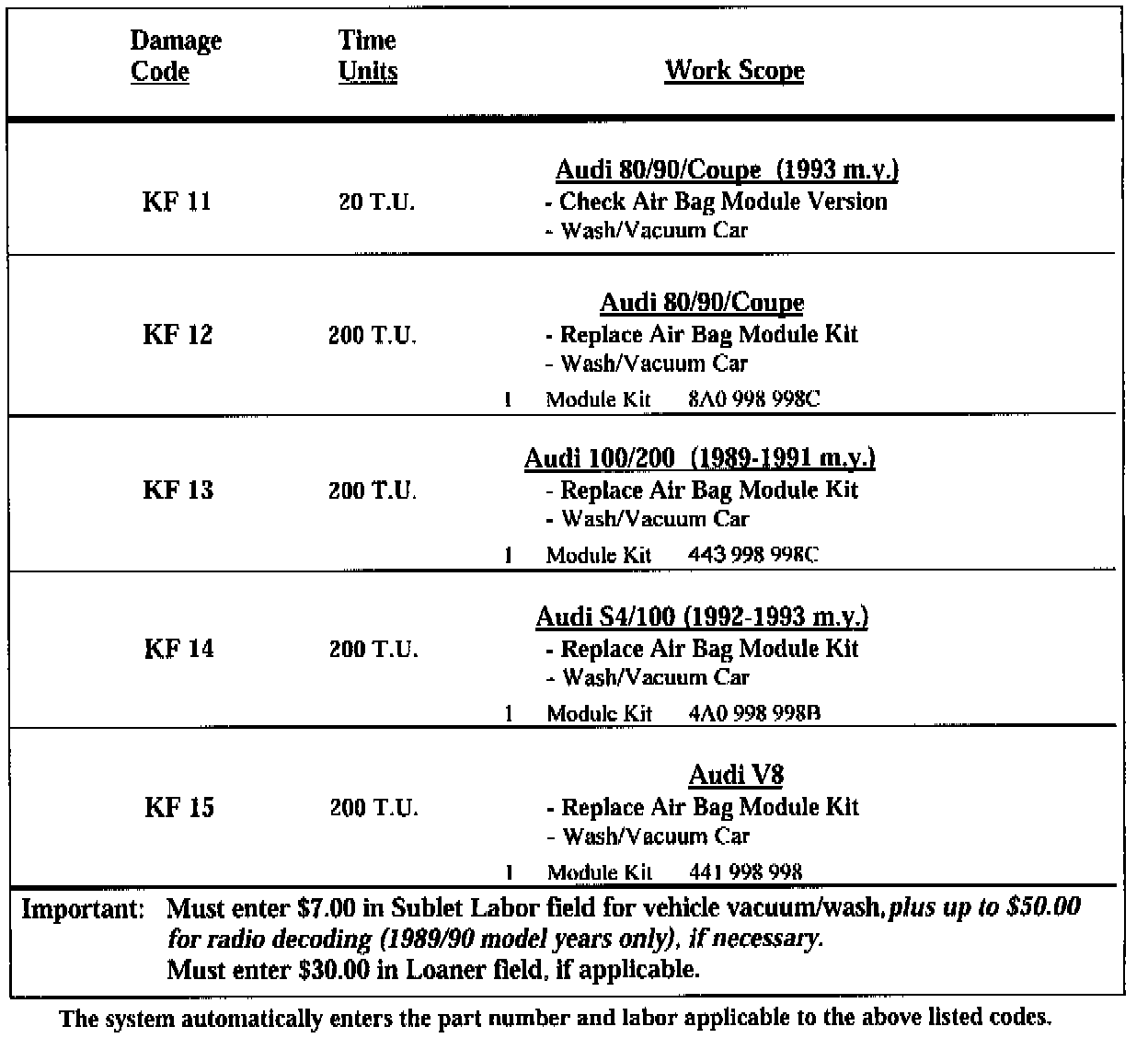 If an affected Audi has equipment installed by sales or service facilities other than an authorized Audi dealer (such as an alarm system, cellular telephone or disc player) which needs to be removed in order to perform the recall work, please inform the customer, prior to performing any work, of the cost of removal and/or reinstallation of such equipment and inform them that extra time and/or parts needed will be at their expense. In the event that the customer refuses, under these conditions, to have the recall performed, it is equally important that the repair order be clearly marked "Customer Refused Repairs" and the campaign system is updated with Damage Code KF20.