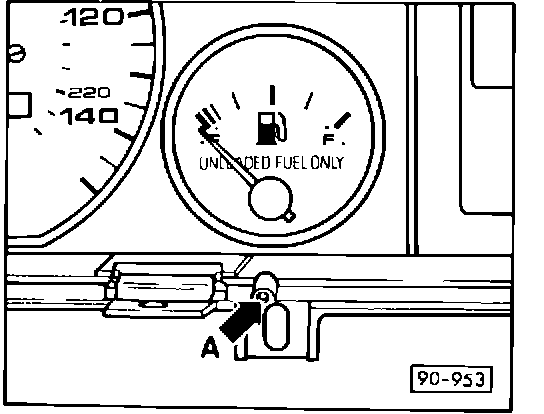 ^ using jumper wires, connect test unit VW 1301 to fuel gauge sending unit connector as shown