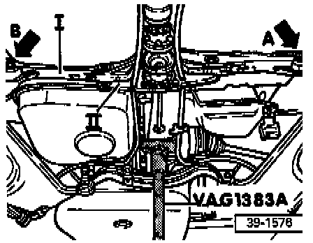 - Remove bolt (arrow -B-) and carefully lower crossmember -Ion right side.