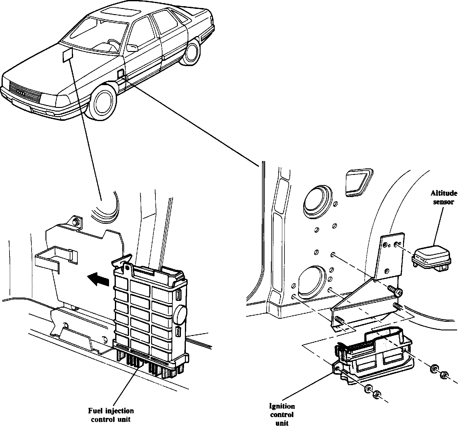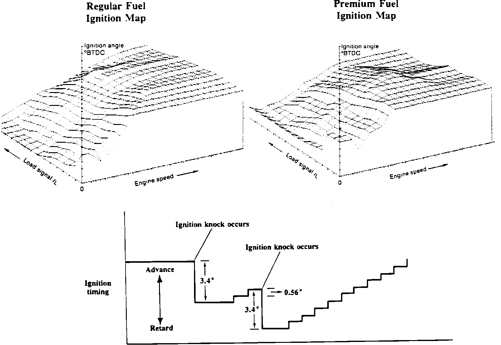 The ignition ECU controls the ignition timing according to complex "maps" programmed into the computer memory. The ECU monitors engine speed, load, and temperature, then plots these points on a complex 3 dimensional graph (ignition map) to determine the degree of ignition advance. A knock sensor is used to detect spark knock. If a knock is detected, the ECU retards the ignition timing for that cylinder from the mapped point, in steps, until the knocking ceases, then gradually steps the timing back to its previous setting. If knocking persists when the timing has been retarded to the maximum (12 degrees), the ECU will switch to a second ignition map programmed for fuels with lower octane ratings. If the knocking still continues, a trouble code will be stored in the computer memory.