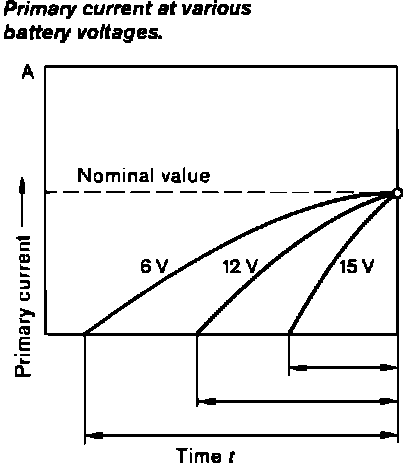 The ignition dwell is controlled according to a similar map. With a constant dwell angle, the charging time changes depending upon the engine speed. At high engine speeds, the charging time is significantly reduced, and consequently, spark voltage is reduced due to insufficient coil saturation. At low engine speeds coil saturation is reached well before spark occurs, resulting in wasted energy and unnecessary coil heating. Since coil saturation is directly proportional to the amount of current flowing through the primary windings, by controlling the dwell angle and voltage, charge time (length of time required to reach nominal current flow and coil saturation) can be controlled. A low voltage results in a slow charge rate, and a relatively long period of time required to reach nominal current flow. A higher voltage has a faster charge rate and correspondingly shorter time to reach nominal current. The ignition ECU monitors the engine rpm, and charging system voltage, determines the required charge time for optimum spark at that engine speed (according to the "map" programmed into the computers memory), and adjusts the dwell angle and the voltage across the ignition coil, to maintain adequate charging time for optimum sparking voltage at all engine speeds and loads.