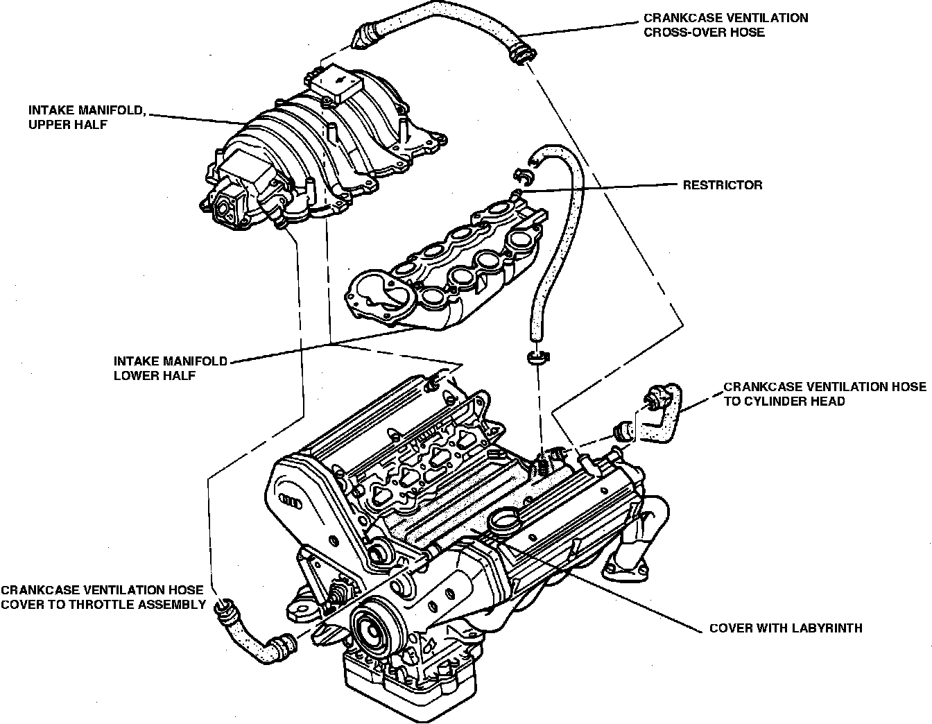 3. If necessary, check the 1mm restrictor in the intake manifold where the PCV connections are for sludge build-up that could interfere with crankcase vapor return. Should this area become clogged, high crankcase pressure would result and cause abnormal amounts of oil leakage from some or all engine gaskets and seals. Clean passages as necessary.