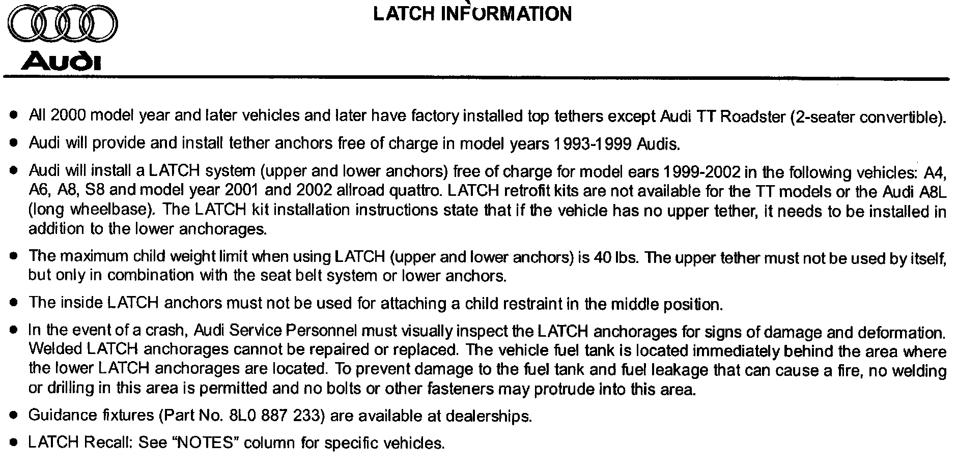 ^ The LATCH owner's manual supplement in the kit MUST be given to the customer when the vehicle is delivered.