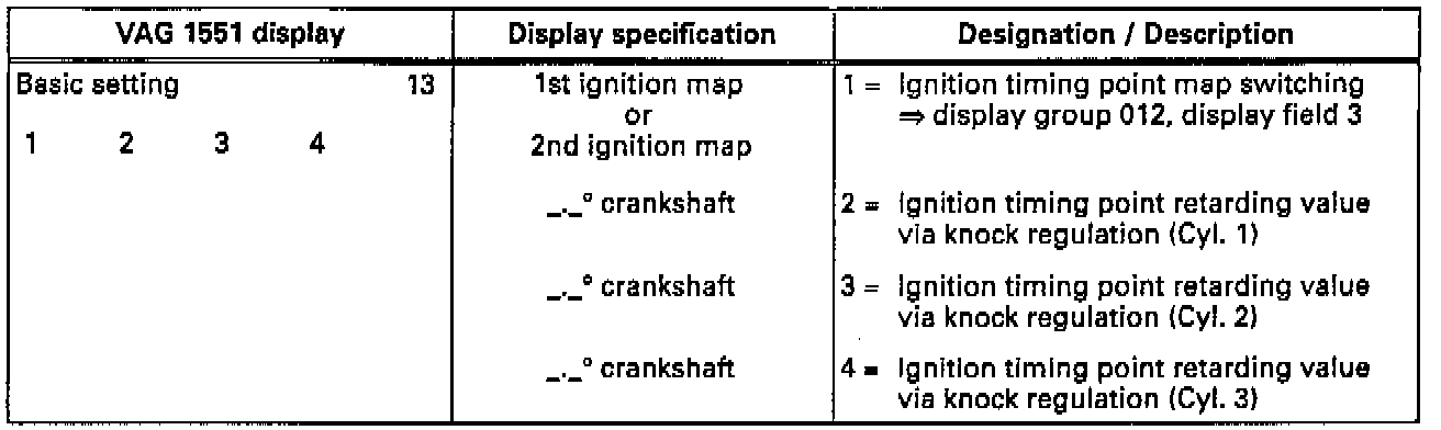 Knock regulation is active at an engine load greater than 40%. If the engine load value exceeds 40%, the current ignition timing retarding values are displayed. When the engine load value drops below 40%, the last ignition timing retarding value used is displayed continuously