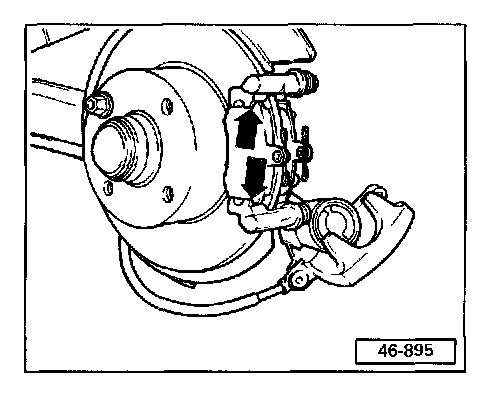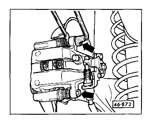 Remove brake caliper housing from pad carrier (arrows). Counter-hold at guide pin.