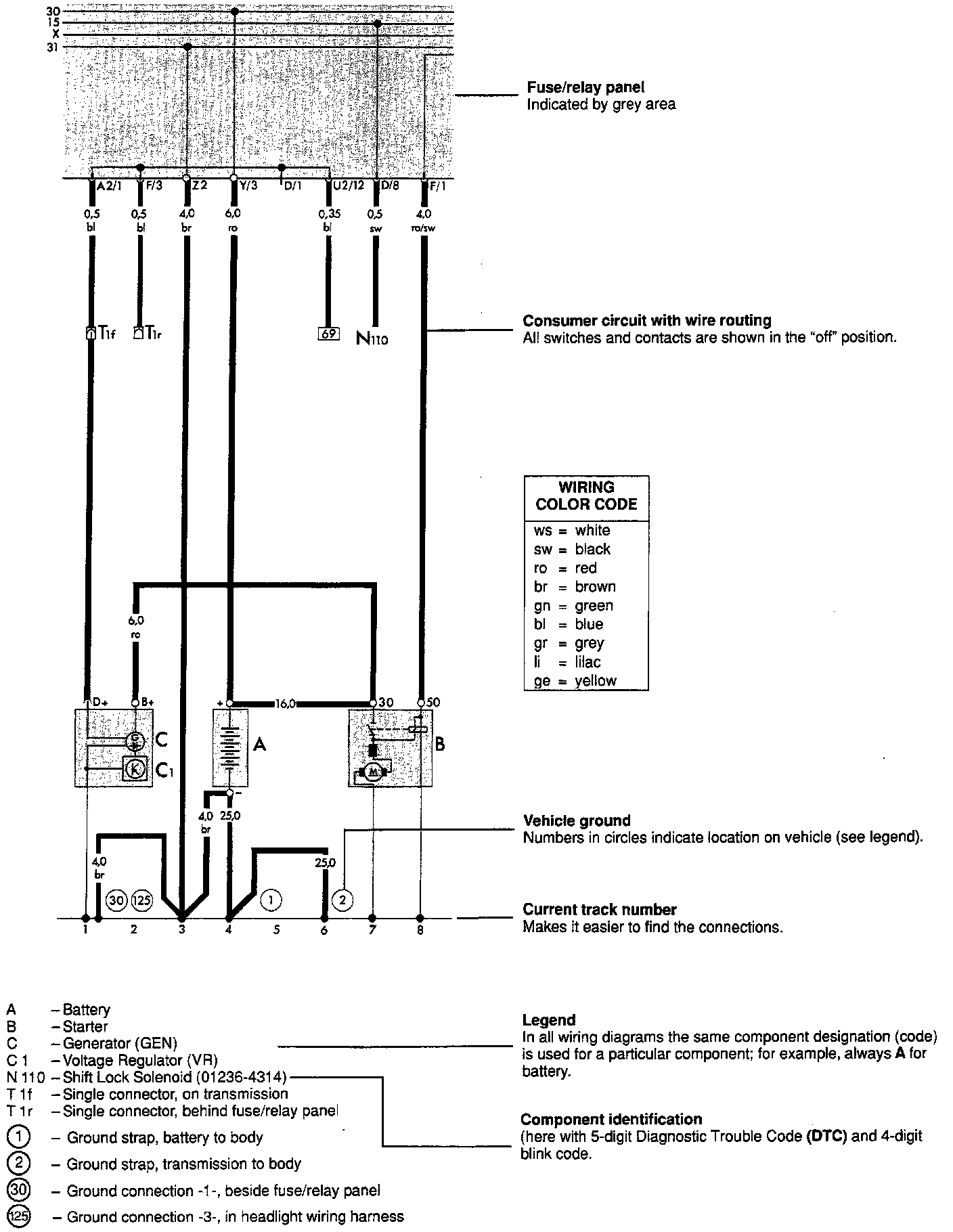 Audi wiring diagrams are divided into two types; the Main diagram and Optional Equipment diagrams. All diagrams are broken up by current track numbers. For 1993-on, diagrams have changed format. Component names are no longer listed on the schematic next to the component. Instead, an alpha-numeric code (example - J124) designates the component in the diagram. A legend at the bottom of each page identifies components (by their code), ground locations, welded harness points, and wire color codes, that are included in the diagram.The main diagram can be found under Diagrams / Electrical / Main Diagrams. Component locations by track number, connector locations, ground locations, and welded harness point locations, and a list of optional equipment system diagrams are also found there.
