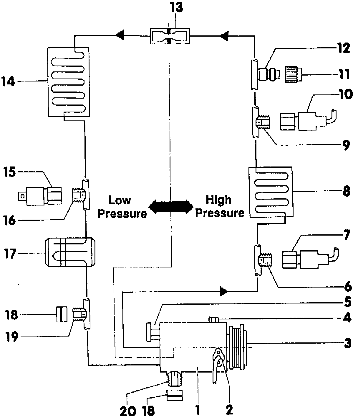 12 - Service valve (high pressure) used for checking system evacuating and recharging