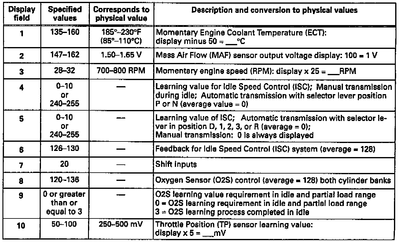 ^ With the elimination of the CO Fuel trim (FT) potentiometer, the CO adjusting value is no longer displayed in display field 9, instead, the Oxygen Sensor (O2S) adaptive value is displayed.