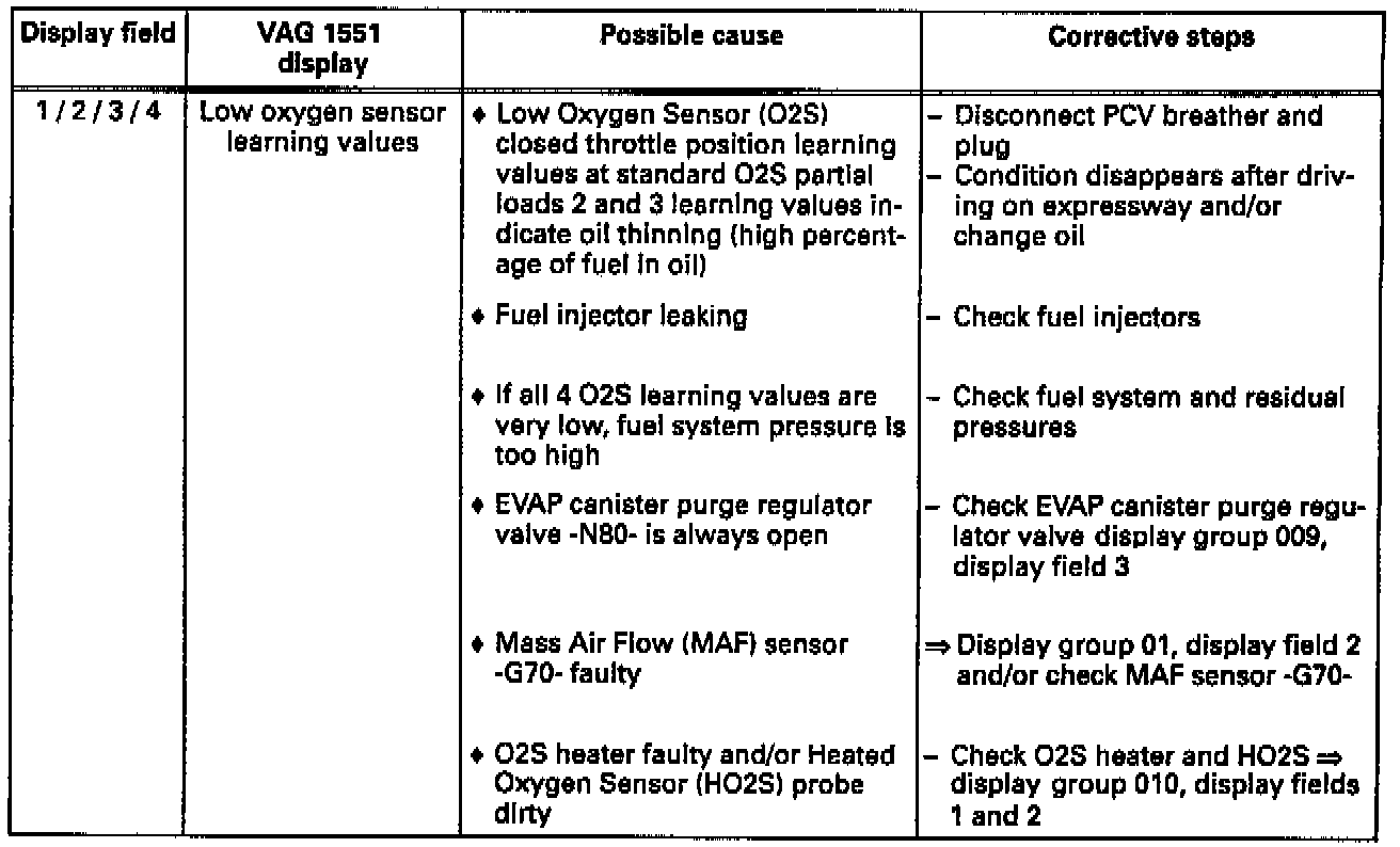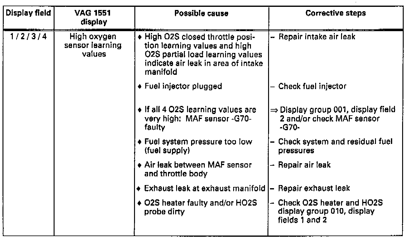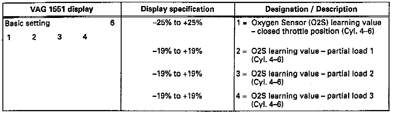^ If a 9% difference exists between the richest and leanest oxygen sensor learning values in one display group, the continued learning of the two affected learning ranges (see display groups 007 and/or 008) is adjusted. The learning requirement display (see display groups 007 and/or 008) of these learning ranges then cannot be 1.