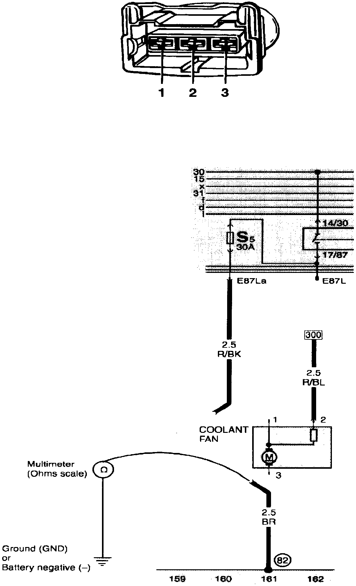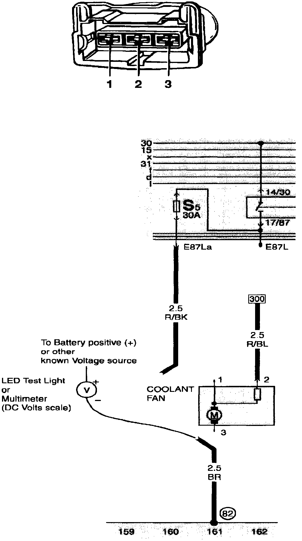 If the test light or multimeter indicates Voltage, then there is potential for current flow between the known Voltage source and ground (GND) at the test point. The ground (GND) side of the circuit, between terminal 3 of the fan connector and battery negative (-), is OK.