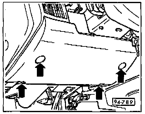 - Remove lower left instrument panel cover.- Carefully pry off screw caps and remove knee bar screws (arrows).