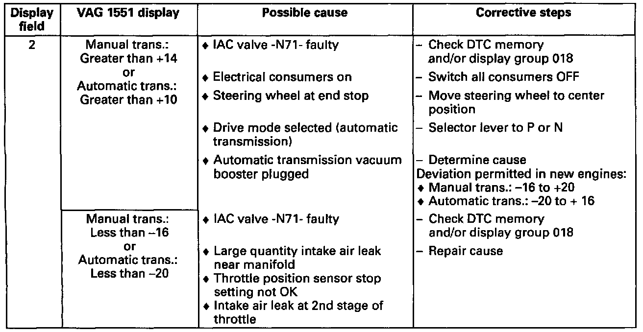 ^ Display values 2 and/or 3 can only be evaluated if the Idle Air Control (IAC) valve lies within tolerance range in closed throttle position (display value 1). If the IAC valve does not lie within tolerance range after 1 minute waiting time, no learning takes place in display fields 2 and/or 3.