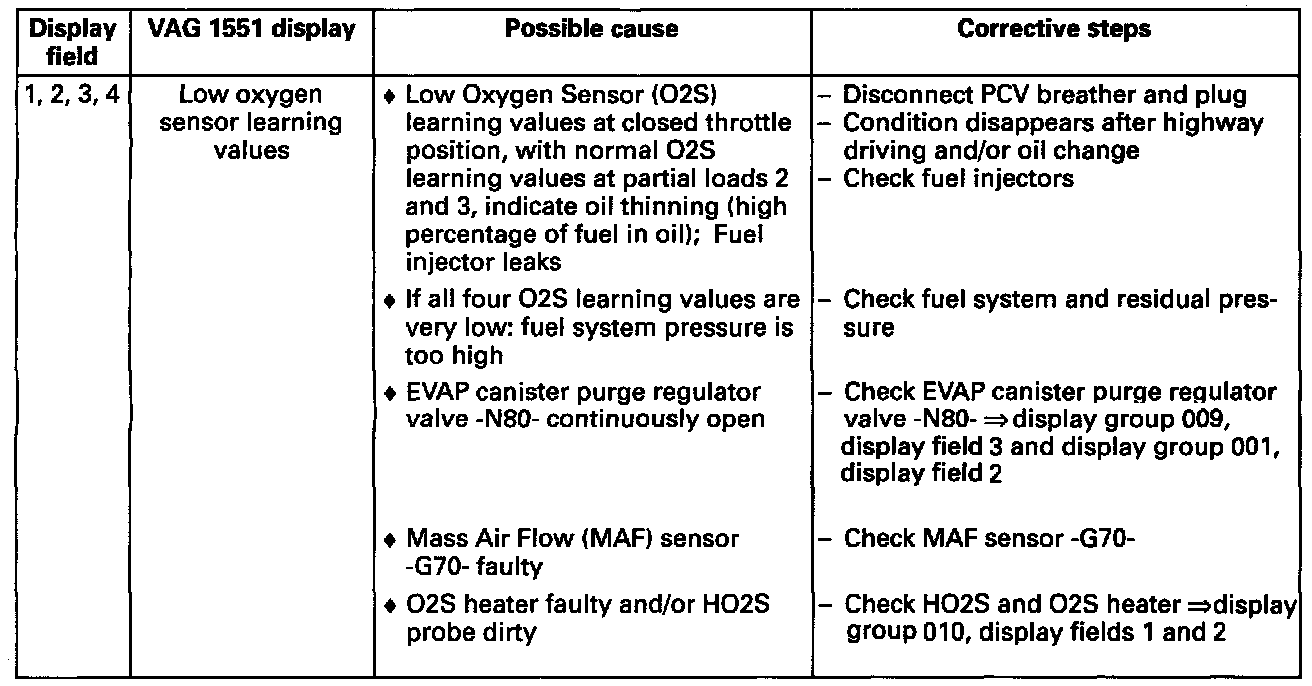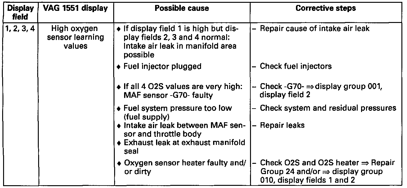 ^ If a 9% difference exists between the richest and leanest 02S learning values of one display group, the continued learning of the two affected learning ranges (see display groups 007 and/or 008) has stopped. The learning requirement display (see display groups 007 and/or 008) of these learning ranges cannot be 1.