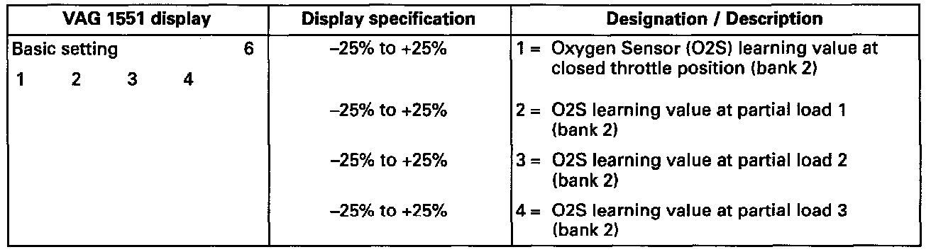 ^ If a 9% difference exists between the richest and leanest 02S learning values of one display group, the continued learning of the two affected learning ranges (see display groups 007 and/or 008) has stopped. The learning requirement display (see display groups 007 and/or 008) of these learning ranges cannot be 1.
