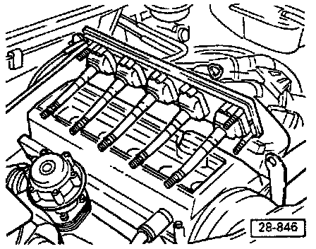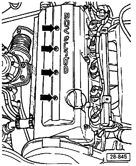 Spark plugs are located under the ignition coils and accessed by removing the ignition coil mounting bracket (arrows) and the ignition coils.