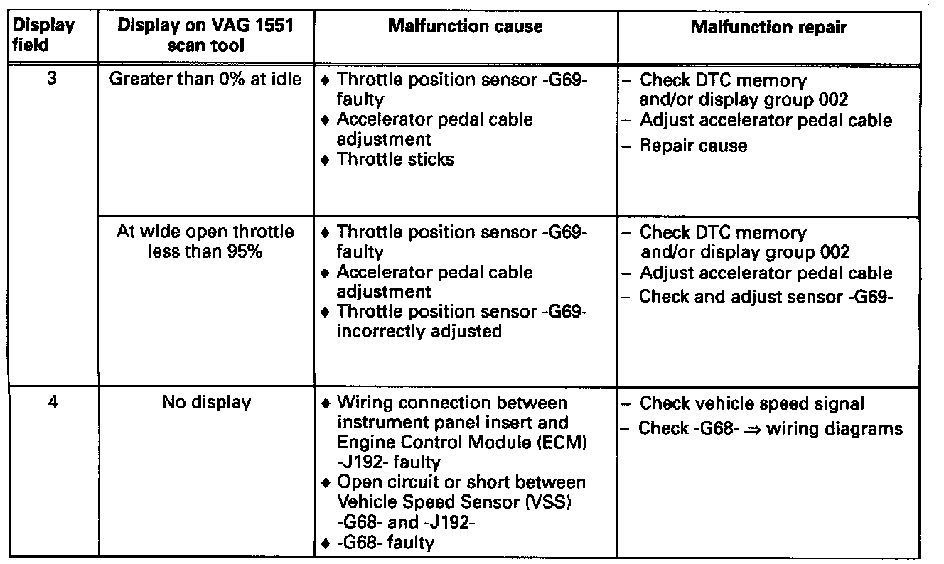 Note on display field 4: If no vehicle speed is shown on VAG 1557 scan tool, first make sure the vehicle speed display is OK. If vehicle speed display is faulty, check vehicle speed sensor wiring diagrams.