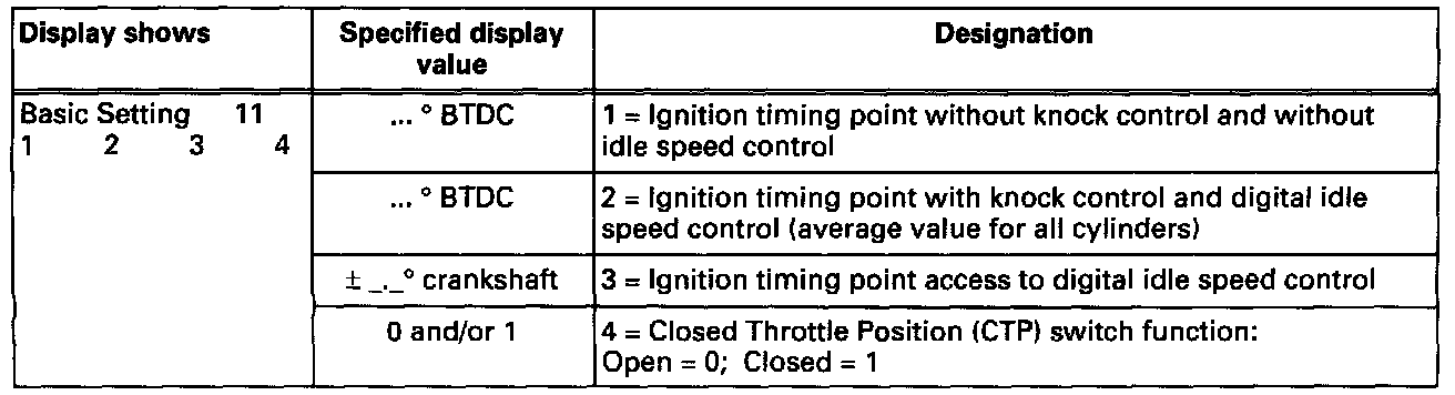 - When the engine speed is increased -CTP switch open- the current ignition timing point is displayed without knock control and without digital idle speed control.
