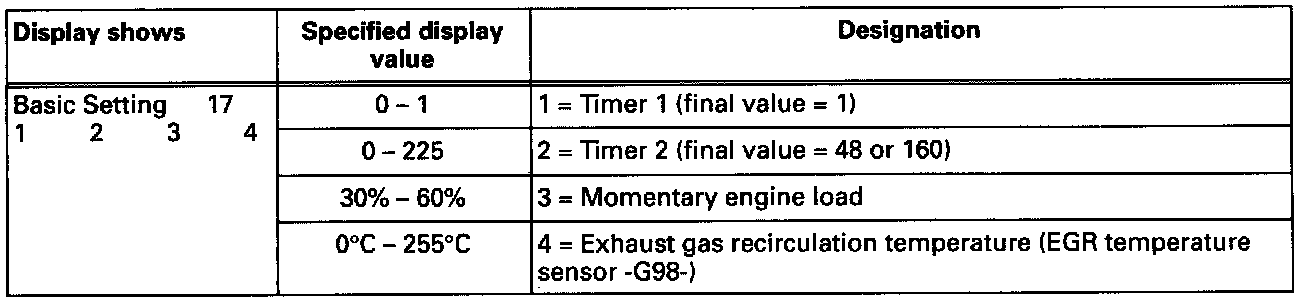 - When reading time 2 is reached, the -J192- checks the EGR temperature (display field 4) again. If the EGR temperature is now greater than 50°C (122°F), the diagnosis is OK and the diagnostic program will be discontinued. If the EGR temperature is again less than 50°C (122°F), the EGR flow test is carried out again.