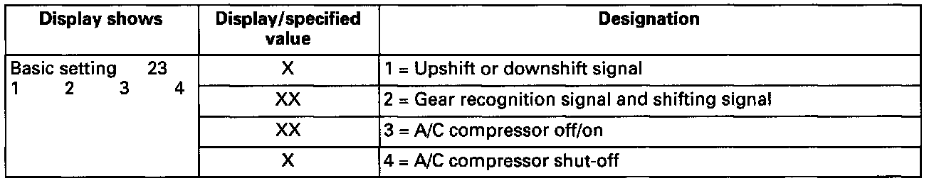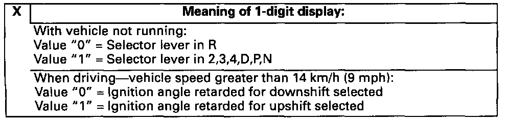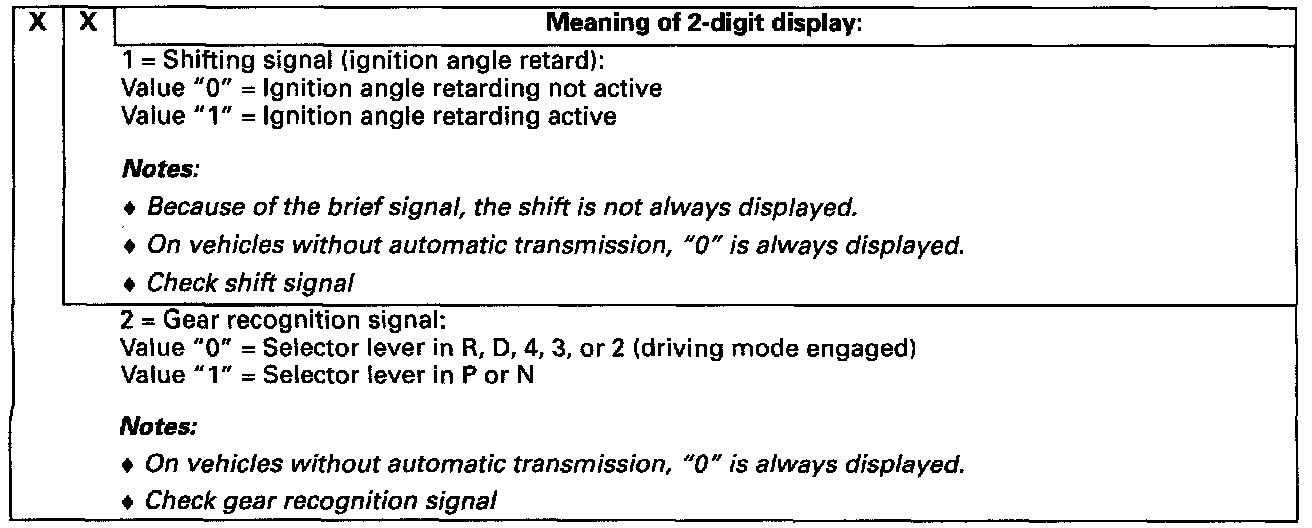 Notes on display field 1: The signal for upshift and downshift will only be output by the Transmission Control Module (TCM) for the automatic transmission 01V For vehicles without automatic transmission 01V, a "1" is always displayed.