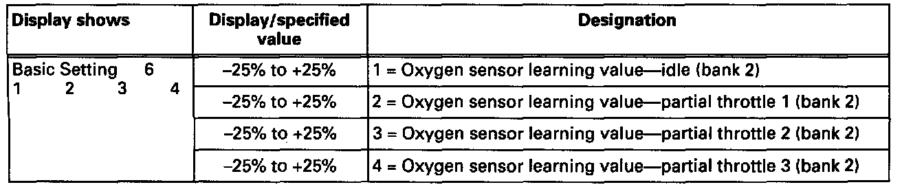 If a difference of 9% is reached between the richest and leanest oxygen sensor learning value of one display group, further learning will be discontinued in the two affected learning ranges (display group 007 and/or 008). Learning requirements display (display groups 007 and/or 008) of these learning ranges cannot be 1.