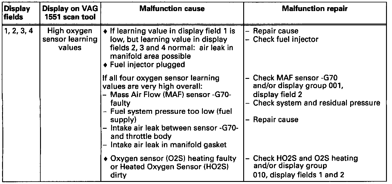 Notes on display groups 005 and 006: If there are differences in oxygen sensor learning values (display group 010, display fields land 2) of more than 8% between display group 005 (bank 1) and display group 006 (bank 2), the following malfunctions are possible: