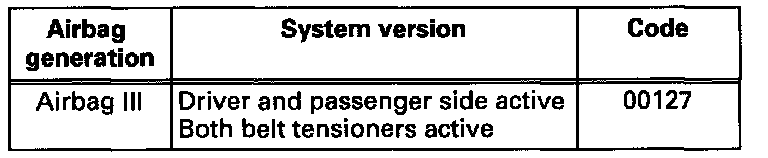 Code table for airbag control module, USA and Canada only