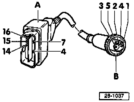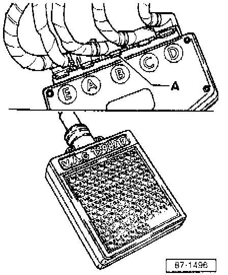 ^ Disconnect connectors from ECM, connect harness connectors to test box VAG 1598/19 (ensure tabs -A- engage) and test using respective sockets of test box.